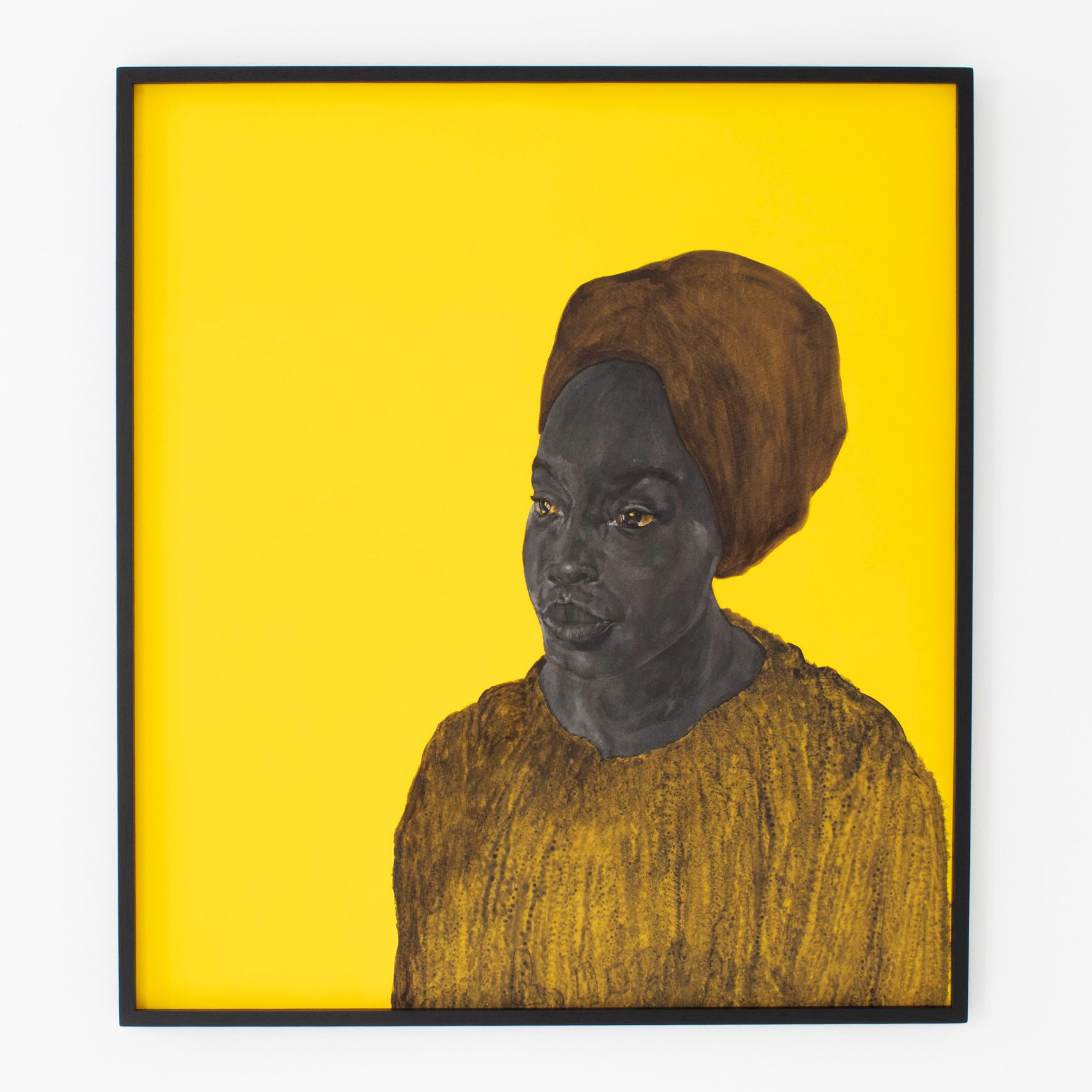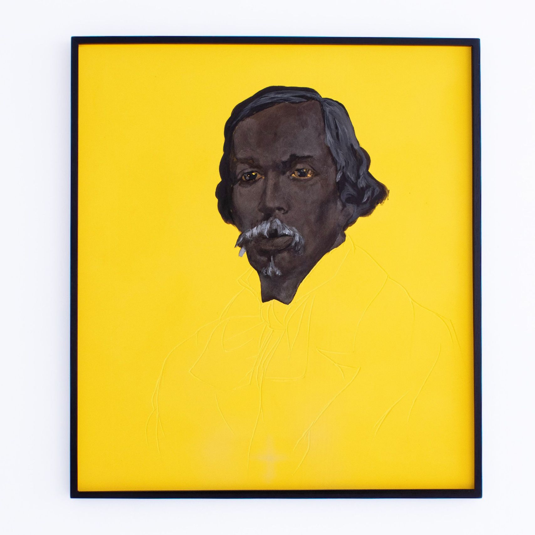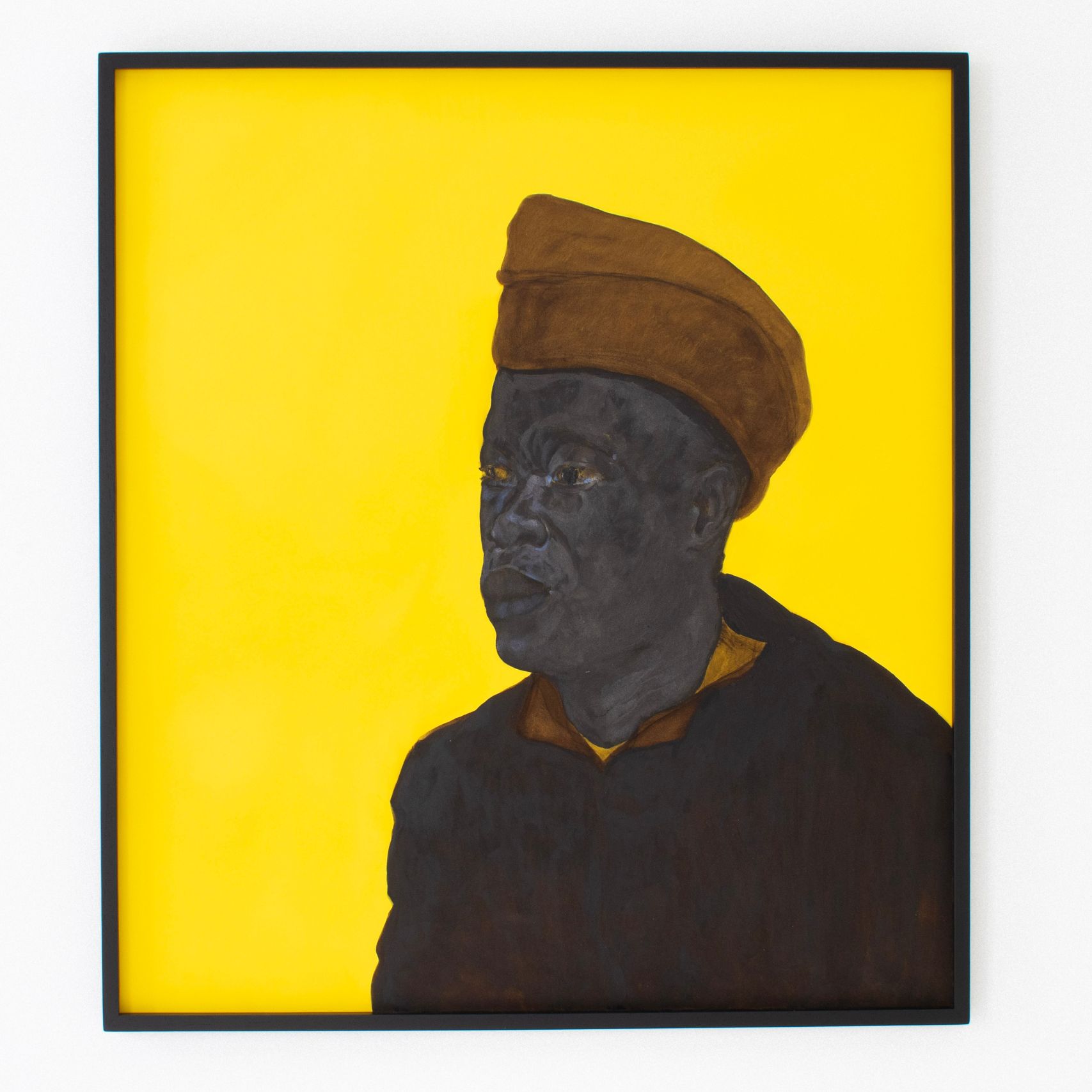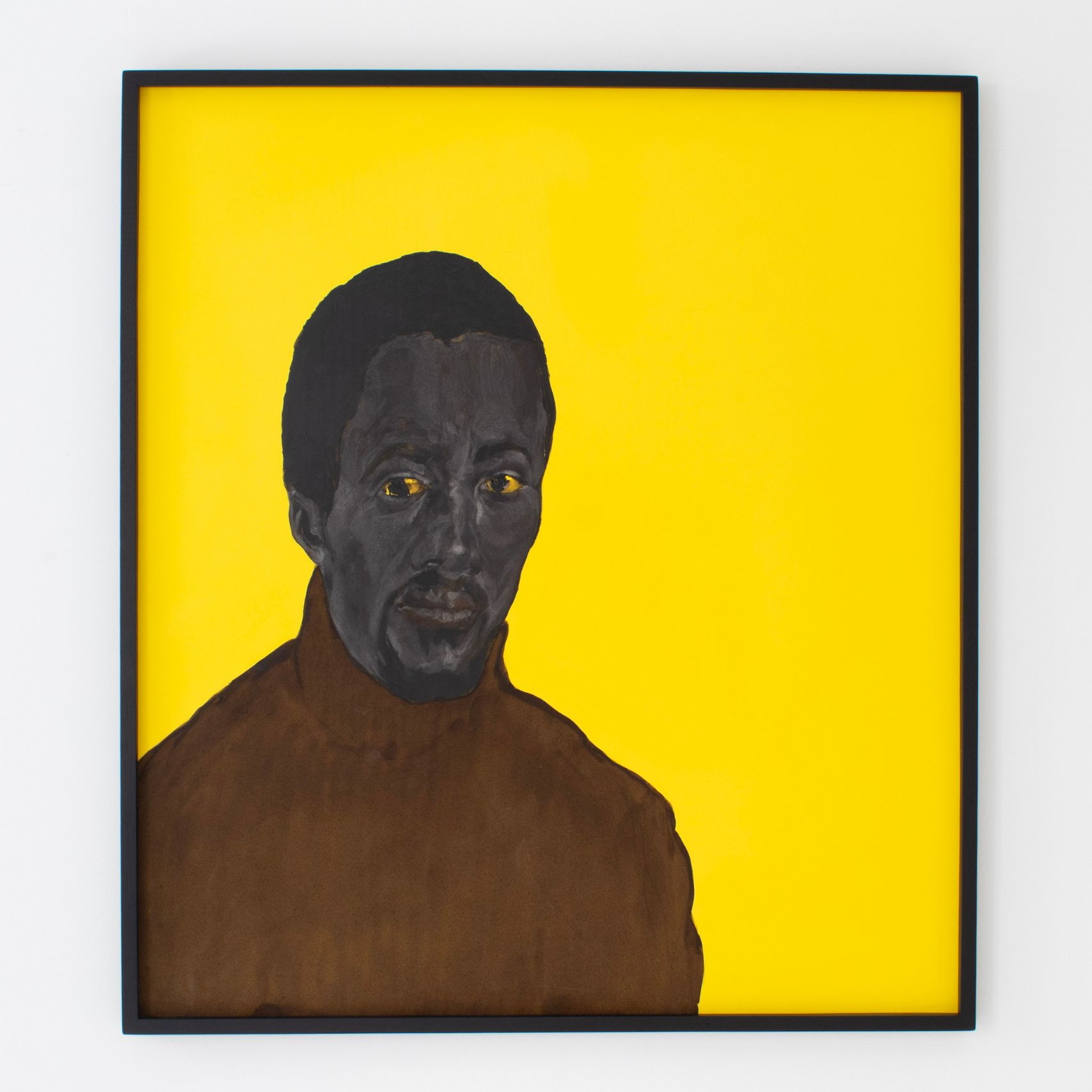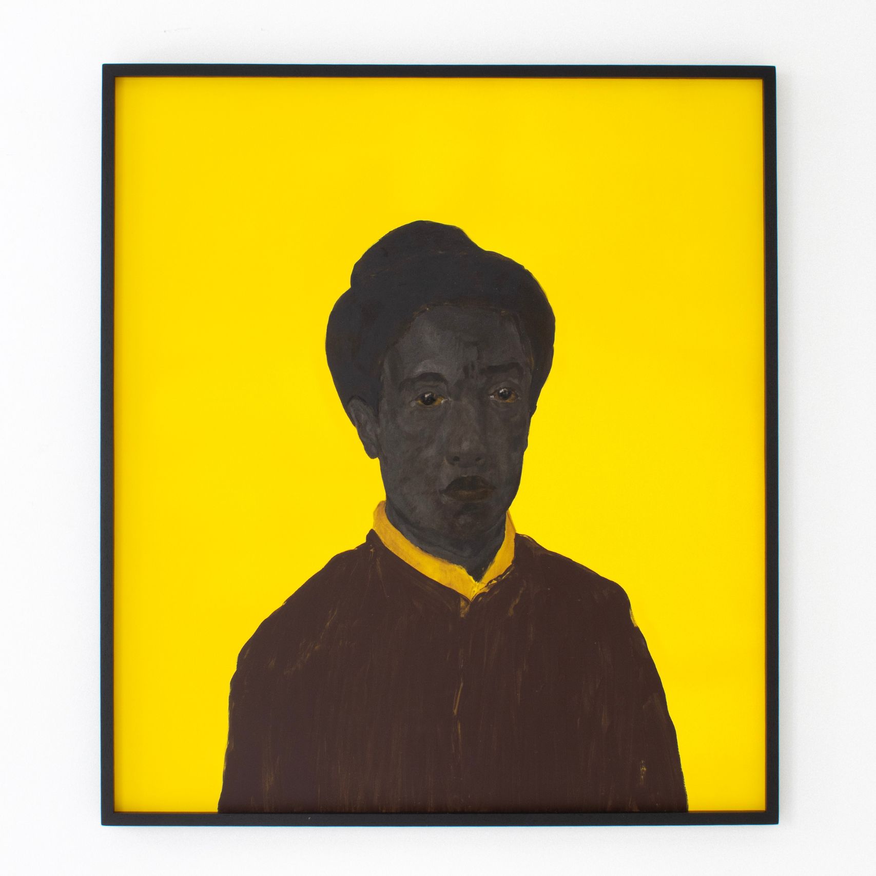 Présentés sur des fonds unis, souvent d’un jaune saturé, ces portraits évoquent la publicité Banania, une icône publicitaire coloniale française représentant un tirailleur sénégalais au sourire figé, réduit à une caricature docile. Cette image publicitaire a largement contribué à naturaliser des représentations paternalistes et caricaturales des populations noires, confinées dans un rôle de servitude joyeuse. Bouhchichi détourne cette imagerie, vidant le fond de sa charge exotisante pour y faire émerger, à la place, une présence pleine, une intensité du regard. Ce jaune n’est plus un décor folklorique : il devient un espace de confrontation, entre stéréotype et dignité réaffirmée.