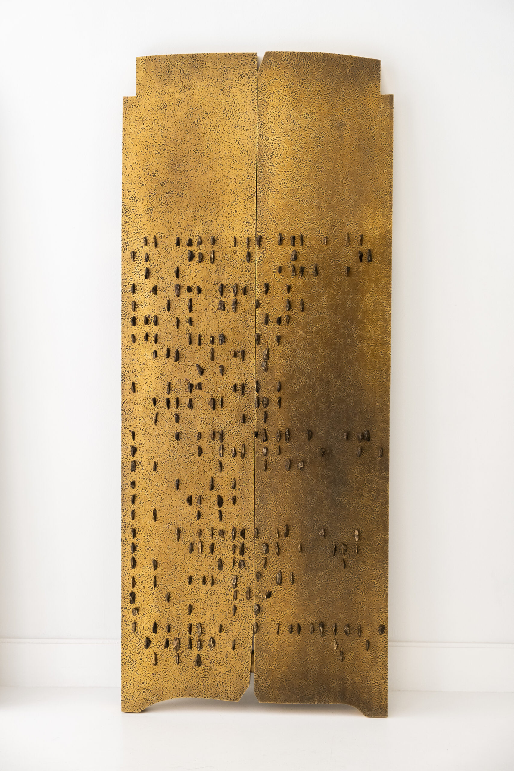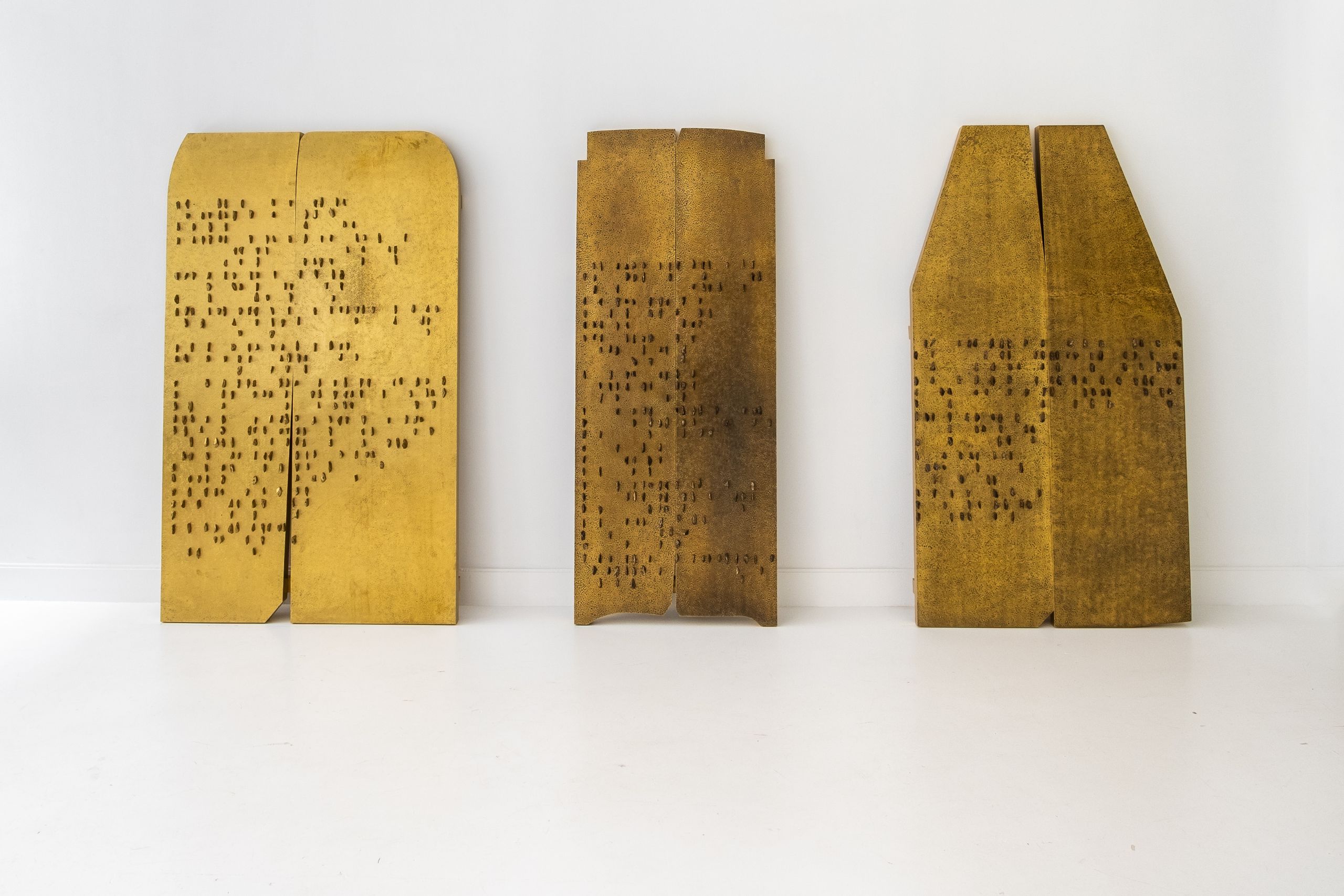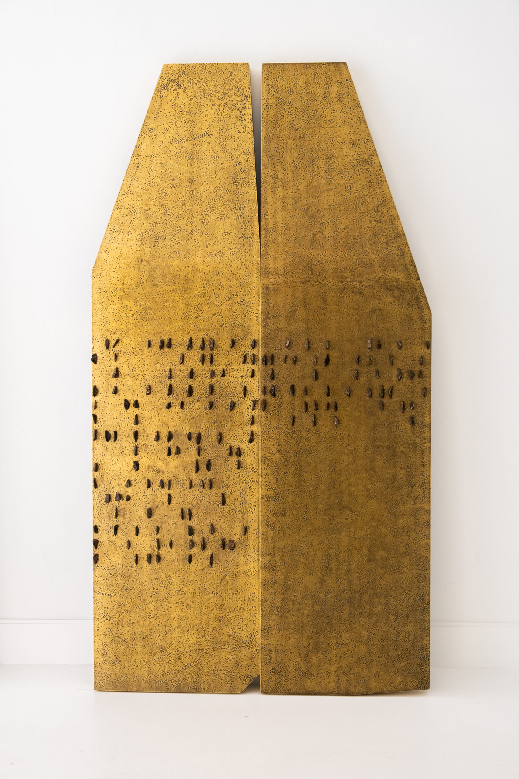 Les sculptures en forme de tribulum prolongent cette réflexion. Fabriqués en laiton, alliage de cuivre et de zinc, ces objets détournent un outil agraire pour en faire un véritable support d’inscription historique et poétique. Le laiton, par sa couleur dorée et sa malléabilité, évoque à la fois la préciosité et la transformation. S’il contient du cuivre – matériau lourdement exploité en Afrique, notamment en Zambie et en République Démocratique du Congo – le laiton en tempère la rugosité brute, introduisant une dimension plus symbolique. Il incarne physiquement les blessures et résistances des corps et des territoires africains, transformés en ressources au service d’intérêts extérieurs. Alliage conducteur, le laiton devient ici un vecteur de mémoire.